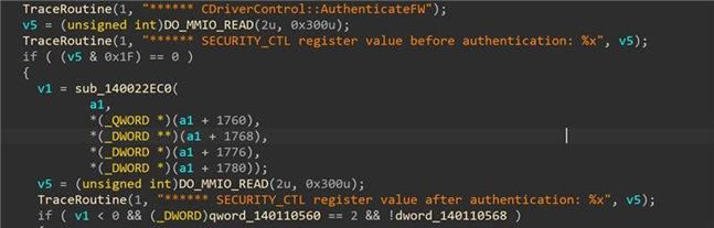Examining sub-routine cross-references suggests that there were at least 261 locations in the version of the driver we analyzed that perform MMIO Write operations and another 184 that perform Read operations. A lot of the locations noted were related to performance counter information and device configuration, but in at least a few locations, the device driver makes decisions based upon the result of an MMIO read, including for Authentication of the device FW image: