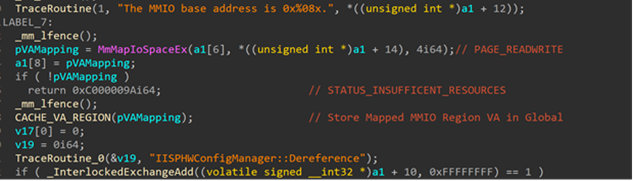 The IspInterfaceNotification routine is registered to intercept PnP notifications for the EventCategoryDeviceInterfaceChange. This event handler is invoked by the PnP manager for future arrivals or removals of device interface instances. The registered PnP operation invokes CISPInterfacedConfigMgr::IaIspArrival on arrival of such a PnP event. This routine sets up an MMIO range for device interface, which it appears to map to some cached globals for the duration of its use (MMIO un-mapping routines are also registered). Wrapper routines that implement spin locks and memory fences on R/W operations wrap accesses to these MMIO regions. Both MMIO Read and write wrappers are present on this cached region.
