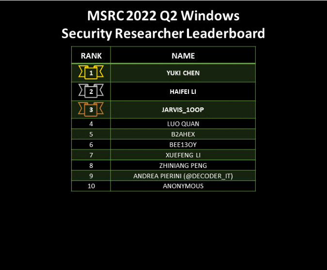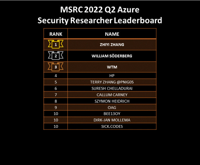 Congratulations to the Top MSRC 2022 Q2 Security Researchers!
