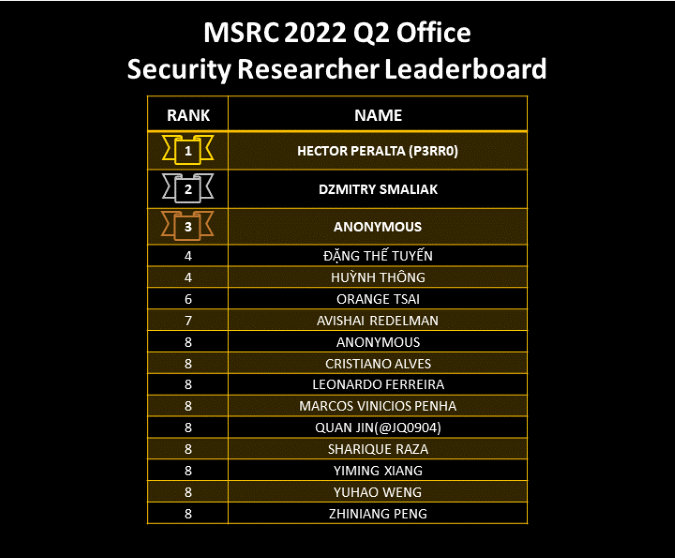 Congratulations to the top Office researchers this quarter: Hector Peralta (p3rr0), Dzmitry Smaliak, and Anonymous!