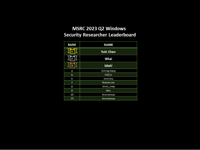 Congratulations to the top Windows researchers this quarter: Yuki Chen, wkai, k0shl!