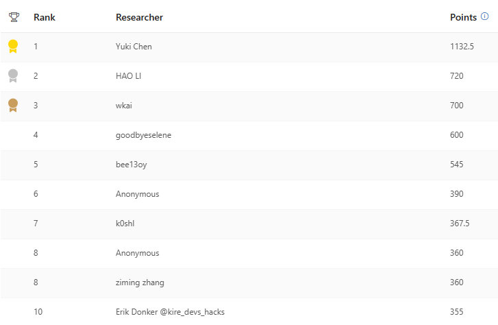 Congratulations to all the researchers recognized in this quarter’s Microsoft Researcher Recognition Program leaderboard! Thank you to everyone for your hard work and continued partnership to secure customers.