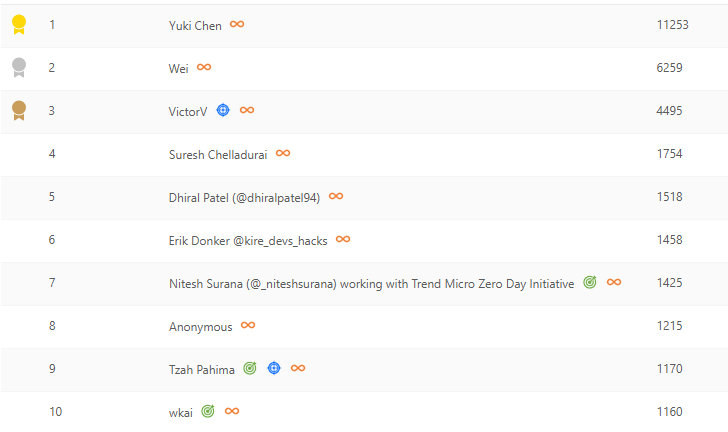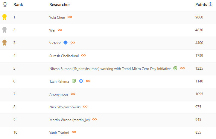 In addition to our top 100 leaderboard, our annual technology area-specific leaderboards recognize researchers who have submitted high-impact vulnerabilities in particular product areas.