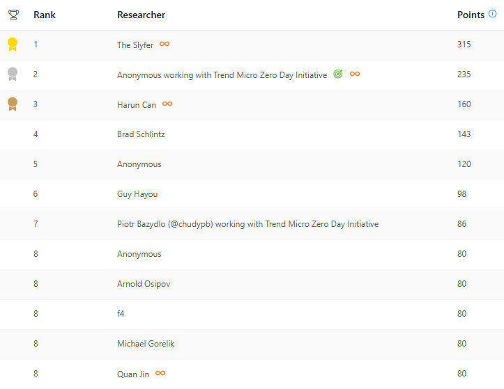Congratulations to the top Office researchers this year: The Slyfer, Anonymous working with Trend Micro Zero Day Initiative, Harun Can!