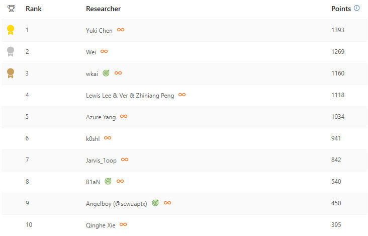 Congratulations to the top Windows researchers this year: Yuki Chen, Wei, wkai!