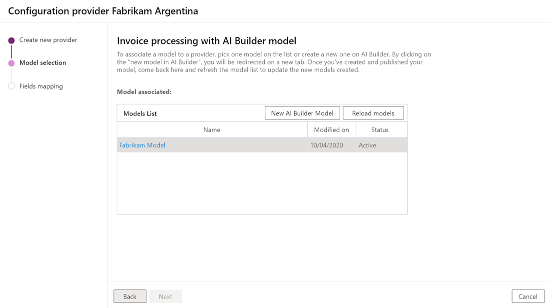In Power Apps, you can configure the sender address for each provider, and the specified AI Builder form processing model to extract the information. Then, you can map the keys of your invoice to the invoice fields provided by Microsoft.