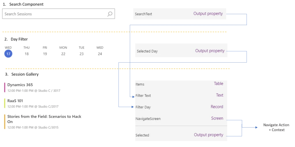 You can see from the image above, The Search component output is fed directly to the Filter Text Input of Session Gallery component. Similarly, the day filter output is fed directly into the Filter Day input of the Session Gallery. The Session Gallery has another input that indicated where to navigate when the gallery is clicked. It also keeps the selected item exposed in the Selected Property.