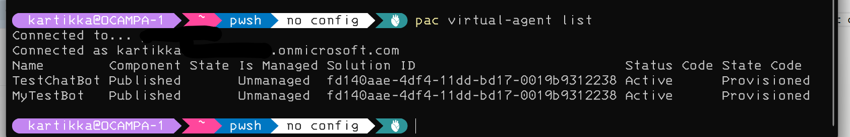 This noun was behind the feature flag for a long time, now it is finally here. We only have one verb for support and that is list. It will list out all the virtual agents in your environment.