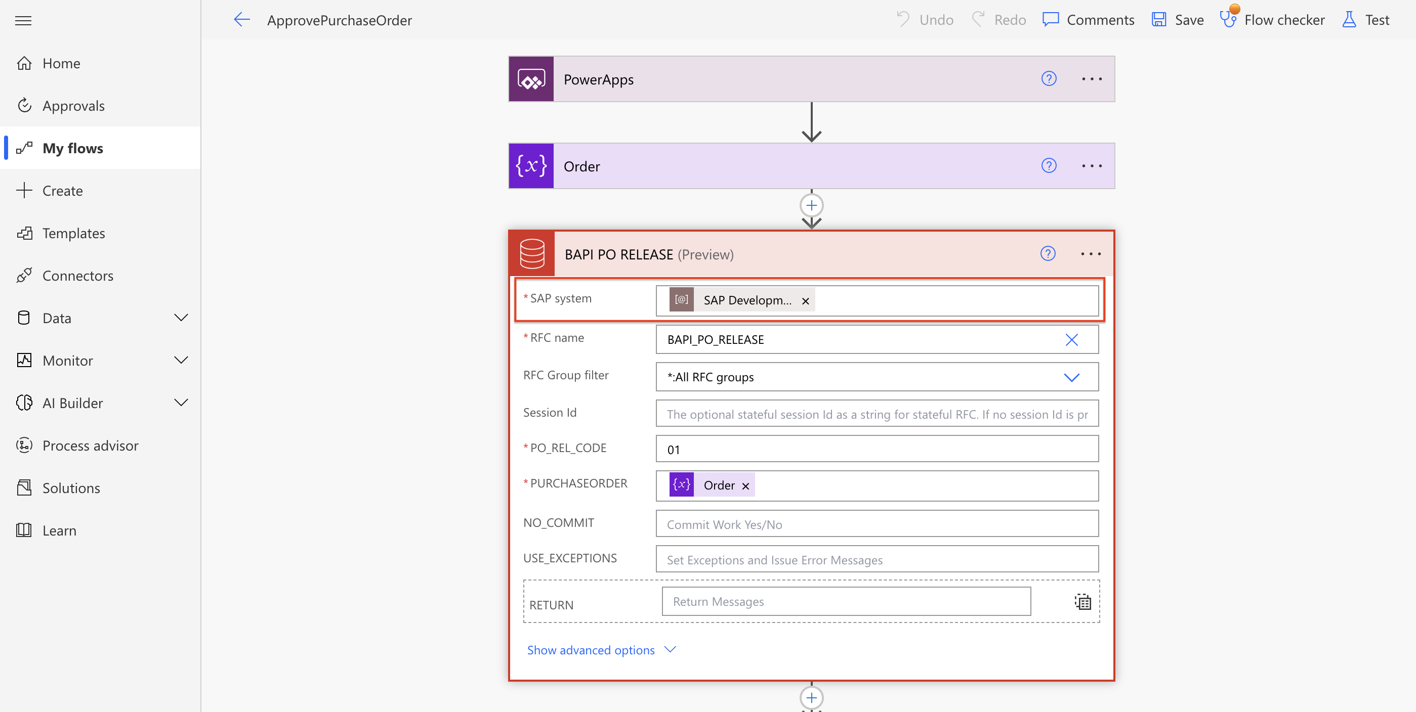 Below is an example of the prebuilt flow for approving a purchase order in SAP: