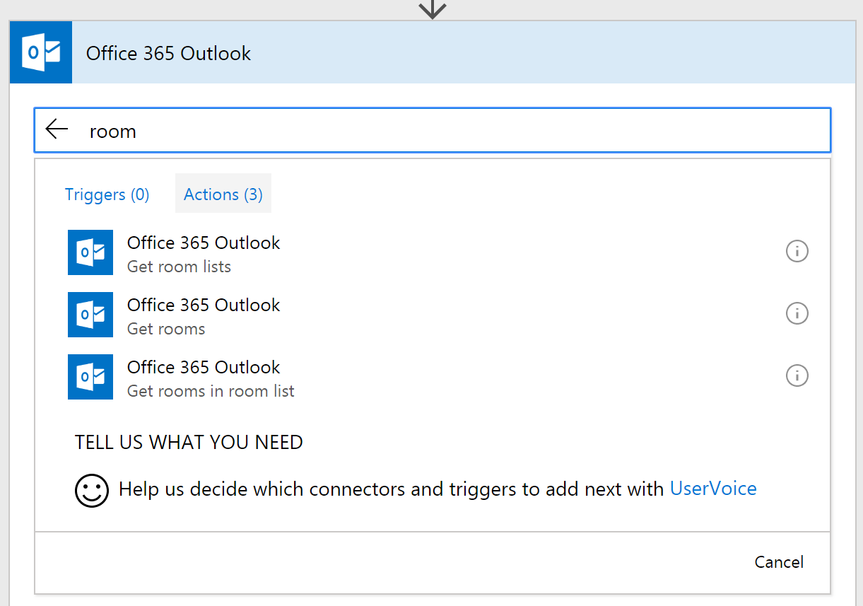 There are new actions in the Office 365 Outlook connector that you can get details about the rooms in your organization. This is useful for meeting scheduling solutions. The specific new actions are Get room list, Get rooms, and Get rooms in a room list.