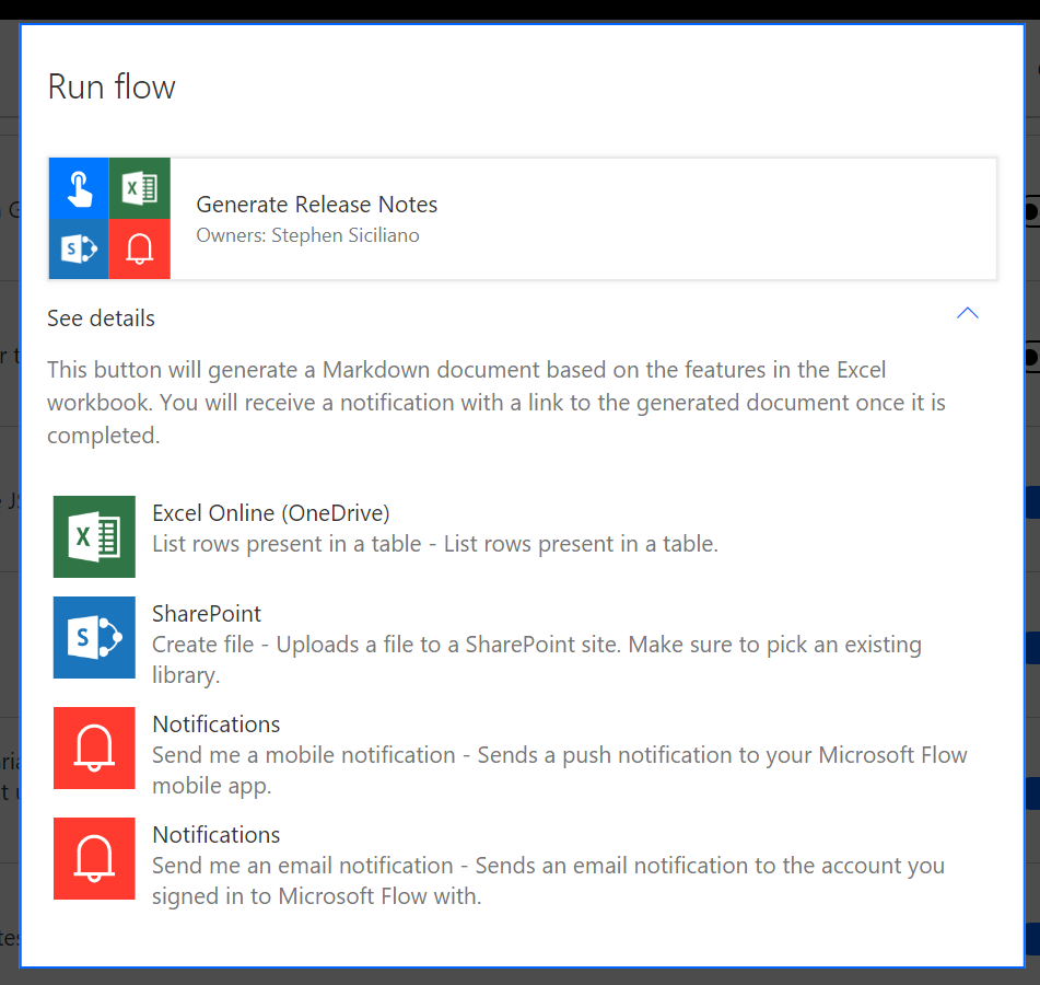 When you run a flow that has been shared with you, you can now see details of exactly what that flow is going to do with your connections. Whenever you run a flow, select See details, and you’ll be presented with a list of every action that flows uses (both name and description). Since the flow can use your accounts or connections, you should only ever run a flow if you trust the owner of the flow, and, are comfortable with them taking the actions listed under See details.