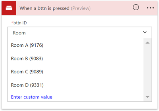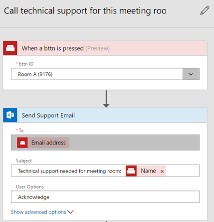 For our ‘Call support’ scenario, you can set up your Bttn with the relevant name (in this case it can represent the room name), and map it to a “Microsoft Flow” Action: