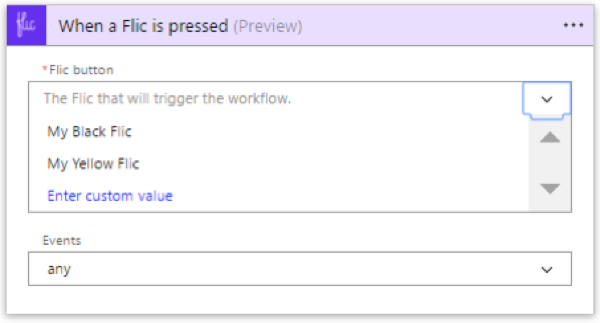 Then,within Microsoft Flow, when creating a new flow from blank or from template, once you select the Flic trigger and sign-in, you will be able to see your registered Flics.