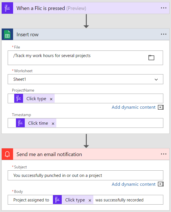 Map the ‘insert row’ steps in the flow to your relevant tracking Google sheet to log ProjectName and Click time. And that’s it, your first Flic flow is configured.