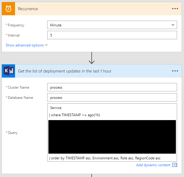We can get the version of the current deployed bits for both the portal and backend service by making a query to Kusto. Further, since a deployment can complete anytime, we run the query every 5 minutes. Even though we run the flow at a 5 minutes frequency, we look at the last 1 hour of data to get the list of recent deployments. This is done to factor in any latency in copying logs from the deployed service to Kusto, clock skews and even transient failures in downstream systems.