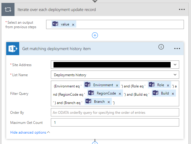 Once we get the list of recent deployments from Kusto, we need to iterate over each deployment record to process them – so, we add an “Apply to each” block. Since the flow runs at a frequency of 5 minutes but looks back at 1 hour of data, it is possible that some of the deployment information has already been processed. To handle this case, we check if for a record a corresponding item has been created in the “Deployments history” list. Since we know the exact record that we are looking for, we can construct an ODATA filter query to get an exact match of this record – if it is in the list.
