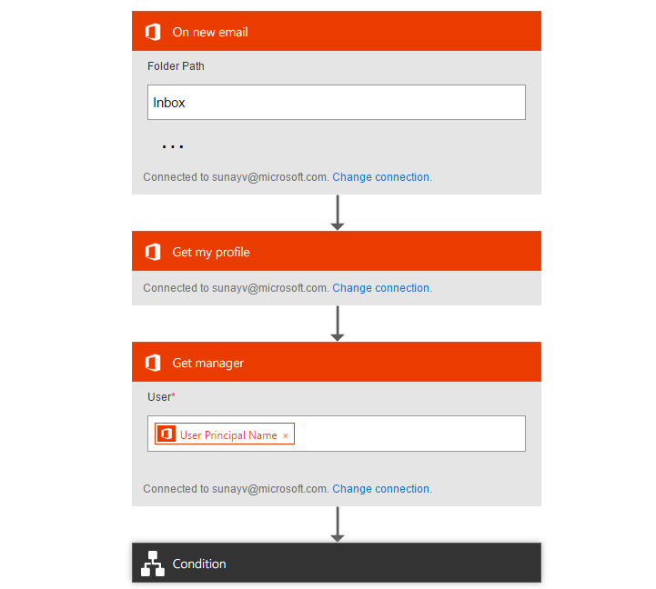 Then, using the Office 365 Users connection, I can programmatically find out my manager’s email address and set up a condition to occur only if the sender matches with my manager’s email address.