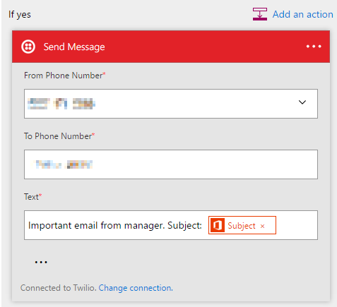 The final step is to setup a channel of notification – I have used Twilio to send myself a text message in this case, with the subject of the email in the text message.