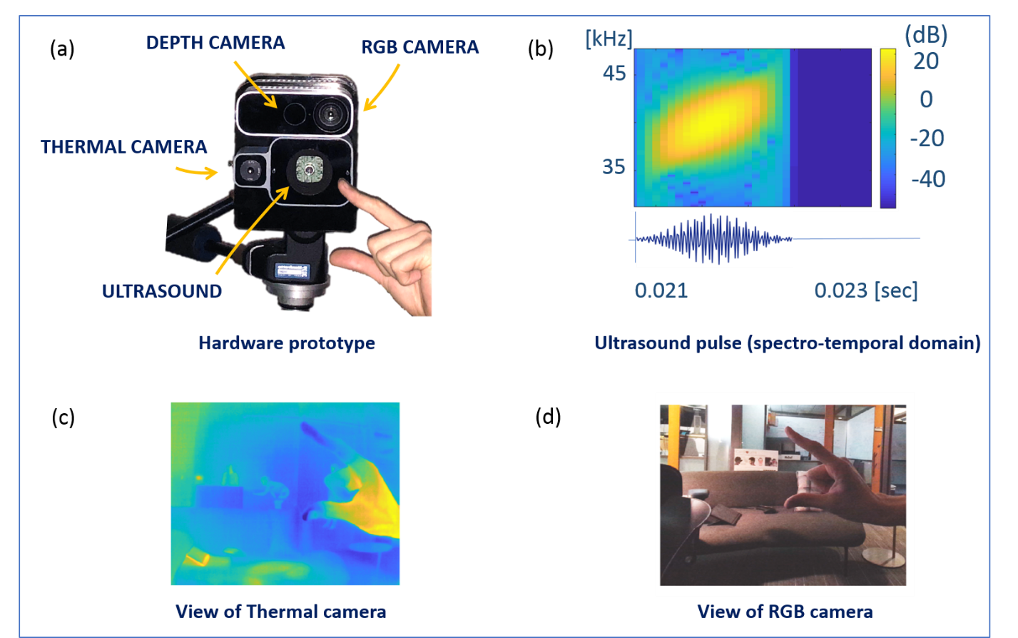 The Audio and Acoustics Research Group, led by Partner Software Architect Ivan Tashev, together with the Microsoft Research Hardware Lab, led by Principal Mechanical Engineer Patrick Therien, developed a prototype device that features four different imaging modalities: depth, RGB, heat, and ultrasound. (See Figure 2.) Depth and RGB images are obtained using Kinect for Azure (opens in new tab). A forward-looking infrared (FLIR) sensor serves as a passive heat camera. Becky Gagnon (opens in new tab) from the Microsoft Research Hardware Lab developed custom circuitry for driving an ultrasound transducer and 8-element microphone array used for ultrasound capture. Lex Story and John Romualdez from the Microsoft Research Hardware Lab created the early version of the prototype and the initial electronics.