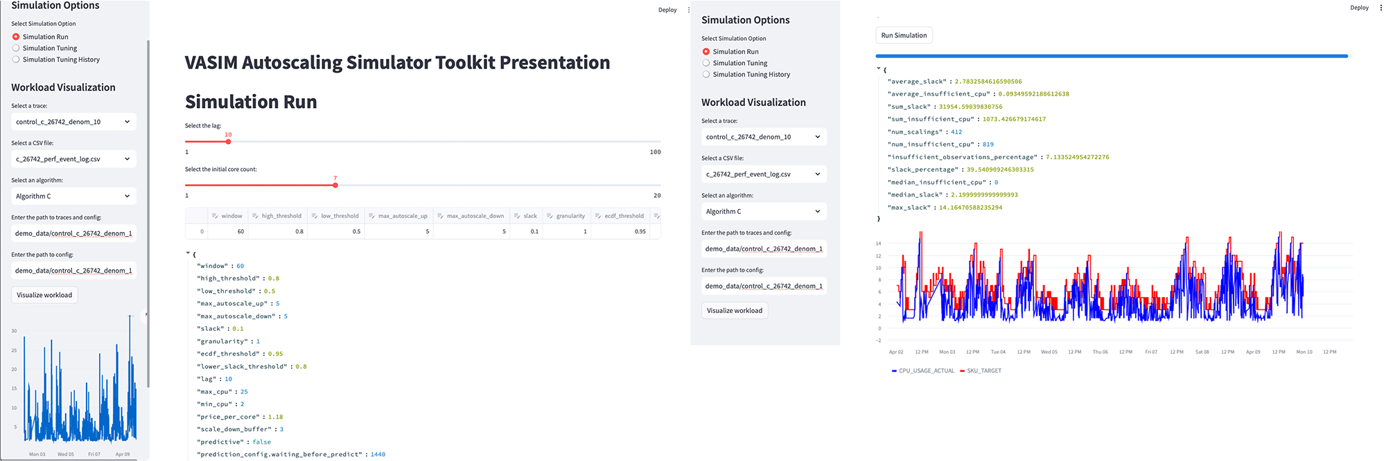 VASIM’s user-friendly interface simplifies the evaluation of autoscaling policies, as illustrated in Figure 1. First steps entail uploading historical data and defining autoscaling policies, including the algorithm and its parameters, shown in the left panel. The Simulation Run feature enables the modification of algorithm parameters, imported via a configuration file, and the execution of simulations based on the selected trace. A results screen displays the CPU limits determined by the selected policies as well as the actual CPU usage tailored to these limits. Additionally, VASIM provides fundamental metrics like throttling incidents, number of scaling operations, and amount of unused capacity, or slack, for the current simulation.