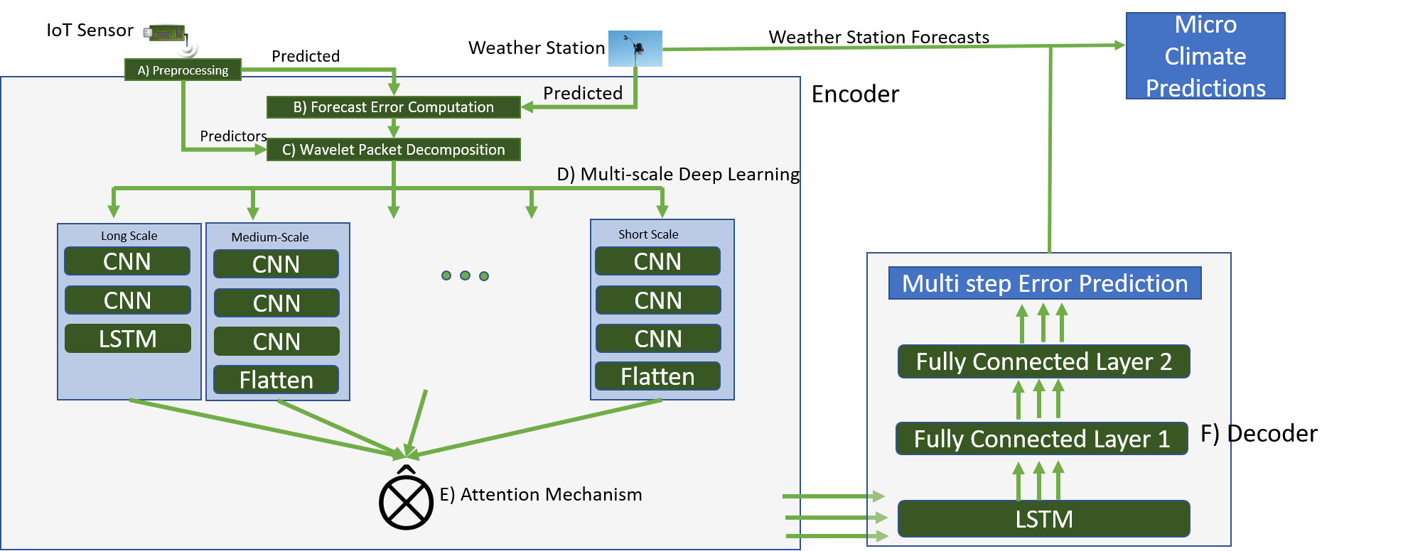Figure 1. DeepMC architecture for the multi scale encode-decoder deep learning system. The architecture consists of 6 distinct parts- A) the preprocessor, B) forecast error computation, C) wavelet packet decomposition, D) multi-scale deep learning, E) attention mechanism, F) decoder. -