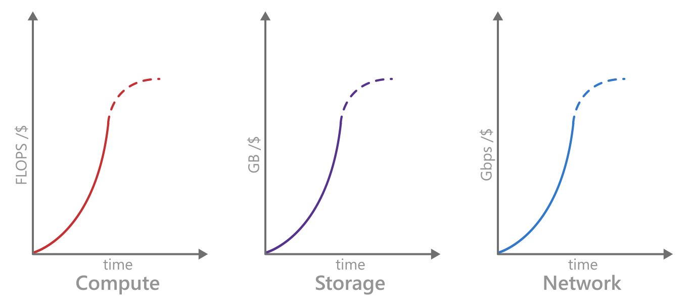 Figure 1: Barriers to current cloud technology are imminent across three key areas. The graphs illustrate how we have been able to deliver exponential growth in performance at approximately the same cost by pushing existing technologies, but they also show how these existing technologies are running out of steam (dashed lines) to meet future demands. The end of Moore’s Law in compute, similar phenomena in storage and networking (also due to the limitations of CMOS scaling), and the fact that data volume is growing at an exponential rate are all issues for cloud technology in its current state.