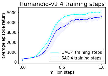 We evaluated OAC on MuJoCo continuous control tasks. In the plot below, we show that OAC outperformed SAC on the Humanoid task. We stress that optimistic exploration as performed by OAC is computationally cheap – we only need to compute one extra critic gradient per sample.