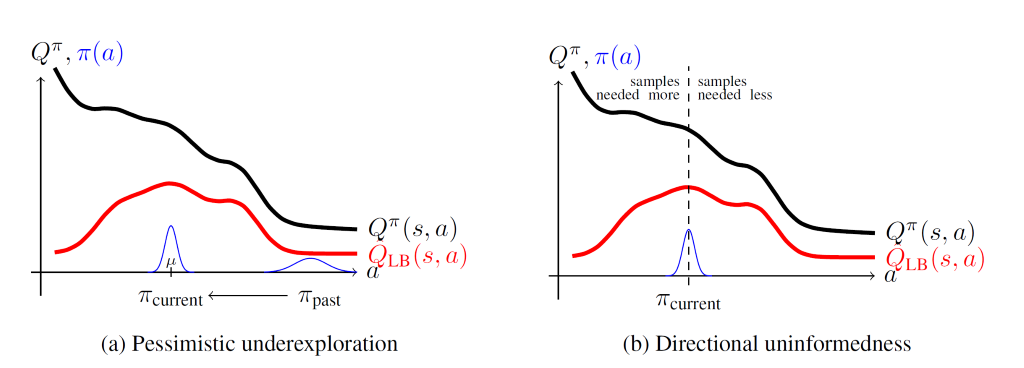 Pessimistic underexploration is shown in Figure 1a. By greedily maximizing the lower bound, the policy becomes very concentrated near a maximum. When the critic is inaccurate, the maximum is often spurious. In other words, the true critic, represented with a black line in Figure 1a, does not have a maximum at the same point.