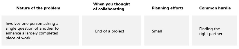 Crawl collaborations are a great way to begin, especially if you’ve never worked across disciplines before. They involve a researcher or data scientist making a simple request to the other while completing their independent work, often toward the end of a project. Crawl collaborations are relatively easy to plan, usually framed around a data scientist wanting to know why or a researcher wanting to understand how much or how many.