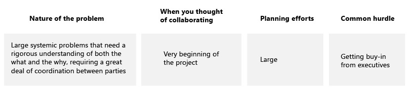 Once your team develops an appetite for collaboration, it’s a good time to seek out those larger, more complex opportunities that generally result in the strongest insights and outcomes. In Run collaborations, data science and research work together against a tightly shared research plan. These collaborations require the most planning, and coordination must start at the beginning of the project. They enable a multidimensional understanding of user experience, such as analysis of people’s interactions with large systems.