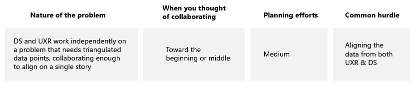 For example, a researcher and data scientist on my team started collaborating midway through a project when they realized they’d landed on different recommendations regarding OneNote migration (opens in new tab). At this point, they pivoted and built a new shared research plan. While they each worked separately, they met regularly to offer refinement toward the other’s work, resulting in a strong and unified message back to the product team. This led to a dramatic change of direction that benefited customers (opens in new tab).