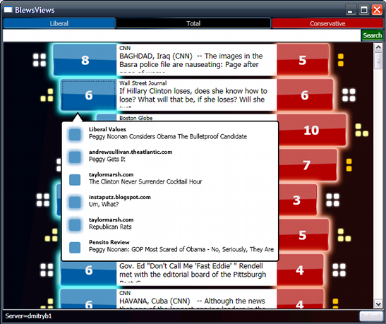 Our current visualization shows the count of liberal inlinks to a news article as a blue “wing” on the left, and the number of conservative inlinks as a red “wing” on the right. The emotional charge of the discussion around the news link is shown as a “heat indicator” on the outside of the wings. Emotional charge ranges from a single orange square to four white-hot squares. Clicking on the wings produces a dropdown of the individual blog posts linking to the news article. In the dropdown, emotionally charged posts have a fuzzy border, while emotionally neutral posts have a solid border.