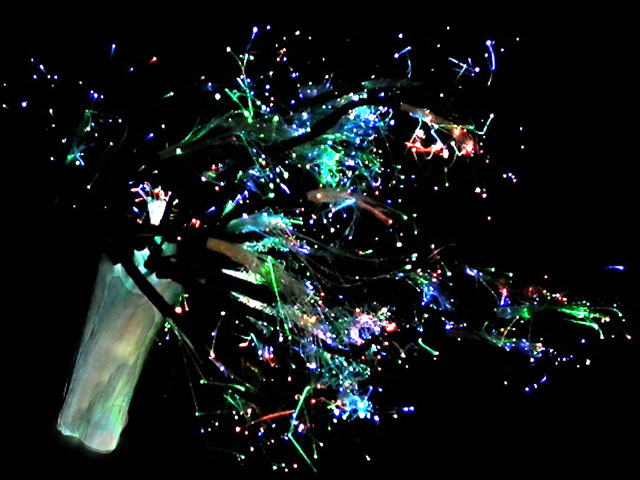 Animated computer graphics are projected onto the base of a fiber optic tree to create a sparse 3D display within the tree. This was done as an entry into Microsoft Research’s MakeFest and demonstrated on 1/10/2014 to the MSRMakeFest community.