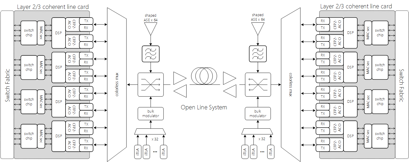 150G 8QAM and 200G 16QAM signals, residing on a layer-2/3 modular switch card with integrated coherent optics, are sent over a fully-loaded, flexible-grid open line system with 104 co-propagating 37.5 GHz channels.