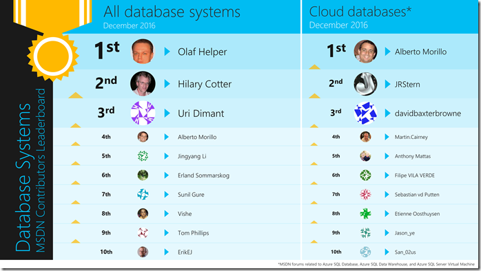 December 2016 Leaderboard of Database Systems contributors on MSDN