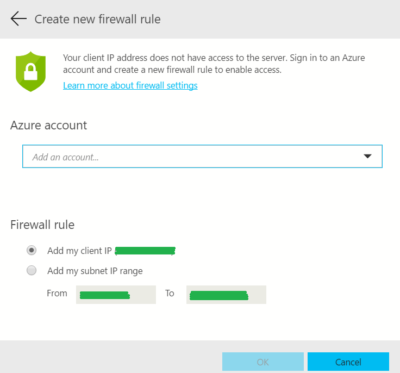 To speed up this process, we have enabled Azure Integration with Create Firewall Rule dialog. When your connection to an Azure SQL DB instance fails because of firewall settings, this dialog will appear, allowing the user to use their Azure subscription account to automatically configure the client IP address with the server. This retains the same experience as configuration on Azure Portal, except you can do it all through SQL Operations Studio.