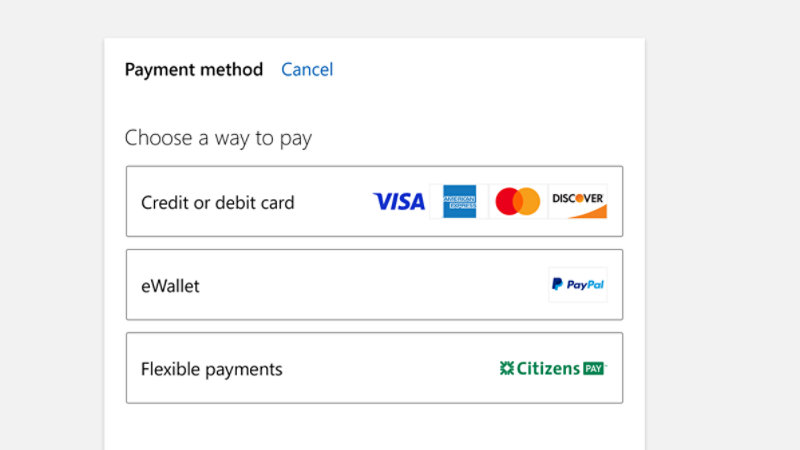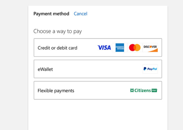 You must have a minimum of $900 in qualifying products in your cart pre-taxes and shipping before you are eligible to apply for qualification for a Citizens Pay Line of Credit. Once you have filled your cart with qualifying items totaling a minimum of $900 before taxes and shipping, go to checkout and sign into your Microsoft Account. Select ‘payment type’ and in the drop-down menu, choose ‘Citizen’s Pay.’ Fill out the form completely and then submit your application. If you are approved, you will be informed that you have a revolving line of credit available to use at checkout.