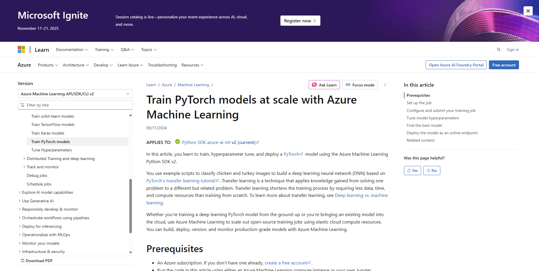 Learn how to train, tune, and deploy PyTorch models at scale using Azure Machine Learning SDK v2 with transfer learning, GPU compute, and hyperparameter sweeps.