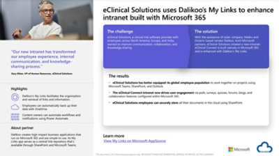 eClinical Solutions, a leading provider of clinical trial software solutions, created a new intranet to transform its employee experience by improving internal and human resources communication, employee collaboration, and knowledge sharing. The new intranet, eClinical Connect, is built natively in Microsoft 365 and enhanced with a leading solution from Microsoft partner Dalikoo, called My Links. Strategy, design, configuration, integration, and ongoing support was provided by sister company and Microsoft partner Velaku. eClinical Connect coupled with Dalikoo’s My Links app and user-centric design by Velaku have improved productivity, collaboration, visibility, and engagement across eClinical Solutions’ 400+ employees in North America, Europe, and India.