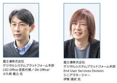 「ビジネスと社内の 2 つの変革を進めることで、自社での実践やお客様との実践を形式知化し、日本型 DX フレームワークを作ることを目指しています。社内 DX については、富士通自身を変革する全社 DX プロジェクトを『フジトラ』と呼び、CEO や CIO ら経営層で構成するステアリングコミッティから、各部門に設置した DX 推進の代表である DX Officer、事務局となる CEO 直下組織 DX Designer、DX を現場でサポートする DX コミュニティやフジトラクルーまでが一丸となってプロジェクトを推進する体制です。DSPU では、社内 IT 部門自身の変革に加え、全社 DX に向けて必要となるツールやサービスの提供と利用の支援を担当しています」(小久保 氏)。