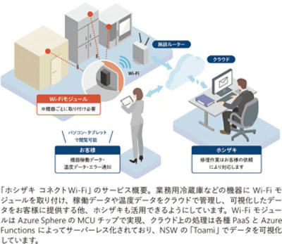 “ホシザキ コネクトWi-Fi は、業務用冷蔵庫などに Wi-Fi モジュールを取り付け、稼働データや温度データをクラウドで管理する SaaS 型の新サービスです。初期費用ゼロで機器の IoT 化を実現し、インターネット経由でいつでもどこからでもリアルタイムで機器の稼働状況や温度を確認、管理、記録できます”