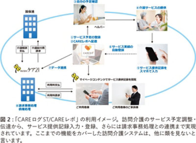 「介護記録システム」がリリースされた翌月の 2020 年 2 月には、ケア21 の主力事業である訪問介護のシステム「CAREログST/CAREレポ」 (図1) の開発がスタート。また 2020 年 3 月には、ケア21 の全スタッフがリモートで研修を受けられる「C-Training」の開発も始まります。前者は 2022 年 8 月、後者は 2021 年 1 月にリリースされています。
