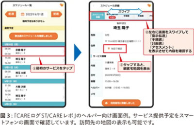 「CAREログST/CAREレポ」を活用した訪問介護業務の全体像を示したのが図 2 です。まず訪問介護事業所でサービス予定を登録すると、その内容がヘルパー (介護スタッフ) のスマートフォンに伝達されます (図 3)。その予定を基にサービスを提供し、スマートフォンでサービス提供記録を入力すると、その内容が自動的にシステムに登録され、訪問介護事業所で確認されます。サービス実績の情報はケア21 社内の請求事務処理システムとデータ連携し、サービス利用者への利用料請求や、国保連への介護給付費請求、さらにはヘルパーの給与計算まで自動的に行われます。またシステムに登録されたサービス提供記録は、サービス利用者のマイページでも閲覧可能です。