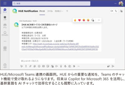 また 2023 年 12 月には、HUE と Microsoft Teams との連携も実現されています。これによって HUE からの重要な通知を Teams のチャット経由で PC やタブレット、スマートフォンなどで受け取ることが可能になったのです。