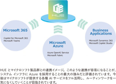 「既に経験があり情報も豊富な Azure であれば、HUE などのインフラとして利用するのも、それほど大きなハードルはありません。またマイクロソフトには、Microsoft Teams や Dynamics 365、Azure OpenAI Service といった先進的なサービスが揃っており、これらとの連携が行いやすくなることも、大きな強みになると考えました」 (小松 氏)。