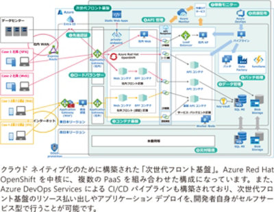 これは Azure Red Hat OpenShift を中心としたコンテナ基盤となっていますが、他にも Azure SQL Managed Instance や Azure Cosmos DB、Azure Cache for Redis、Azure Data Factory など、数多くの PaaS が利用されています。また、DevOps を実現するための CI/CD パイプラインには Azure DevOps Services を採用、自動ビルドとデプロイが行えるようになっています。