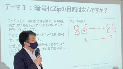 「セキュリティを簡単にするための情報分類」と題されたそのワークショップでは、“ガバナンスと PDCA サイクル” や、日本マイクロソフトの分類マトリクスを例とした “シンプルな分類のためのマトリクス” などを説明した上で、「一般的によく利用されている「社外秘」というラベルでは (情報分類と権限管理を) どのように定義するのが良いでしょう」といった設問を提示。チームでディスカッションを行うなどのプロセスを経て、社内に理解が広がったと言います。