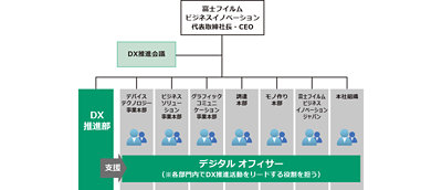 事業の主軸を「ビジネス DX」へとシフトし、「ビジネス イノベーション パートナー」としてお客様の変革をリードしている富士フイルムビジネスイノベーション株式会社。DX推進部と各部門の「デジタル オフィサー」が連携する体制で、社内業務の DX にも積極的に取り組んでいます。